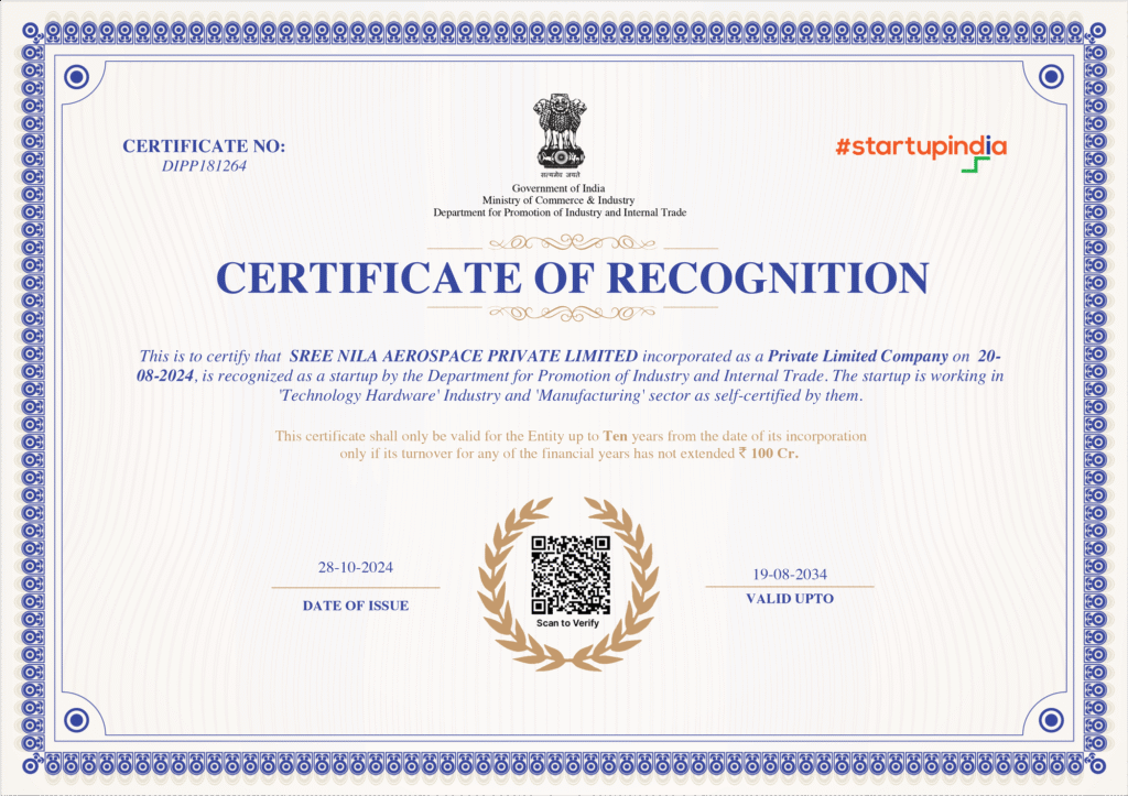 Official recognition by the Government of India’s Department for Promotion of Industry and Internal Trade (DPIIT), certifying Sree Nila Aerospace as a registered startup in the Technology Hardware and Manufacturing sector.